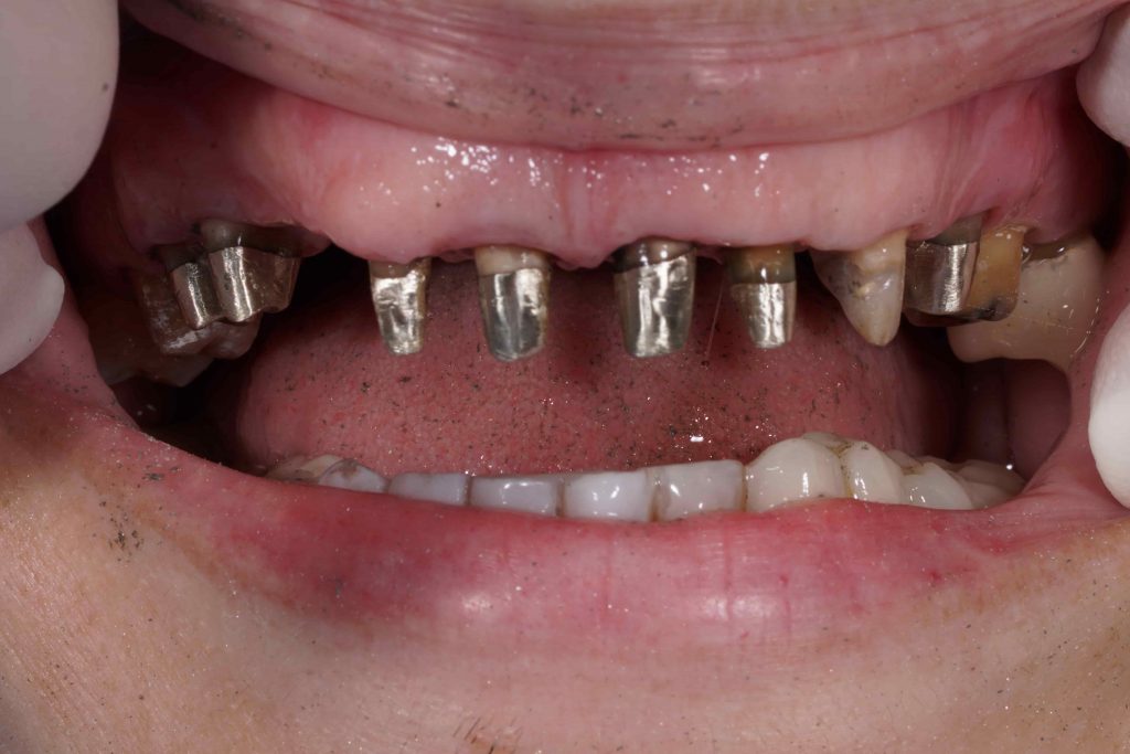 Верхний прикус пациента не подлежит восстановлению, так как зубы были слишком подвижны, чтобы поддерживать несъемные протезы в долгосрочной перспективе.