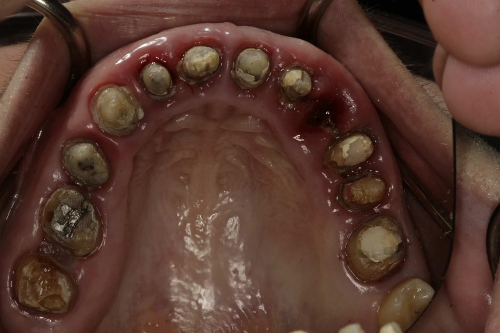 Тяжелый пародонтит. Функциональный и эстетический коллапс. Верхние зубы считаются невосстанавливаемыми