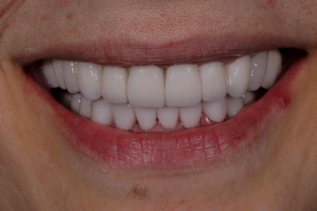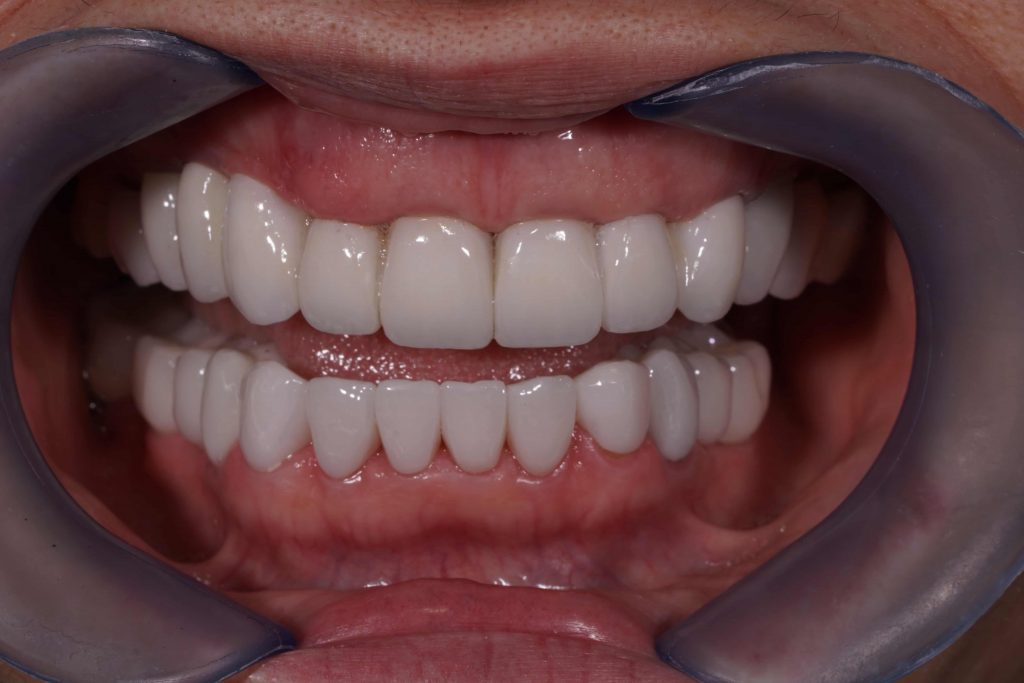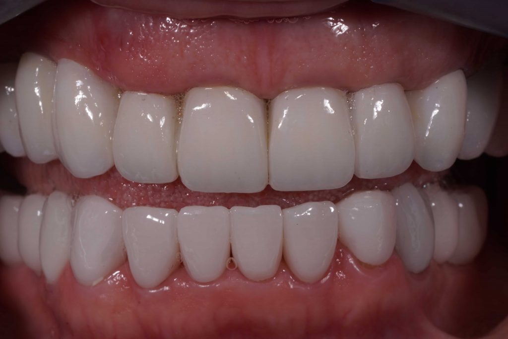 Окончательными реставрациями были 360 виниров/коронок из диоксида циркония на зубы и мосты из диоксида циркония на имплантатах из диоксида циркония.