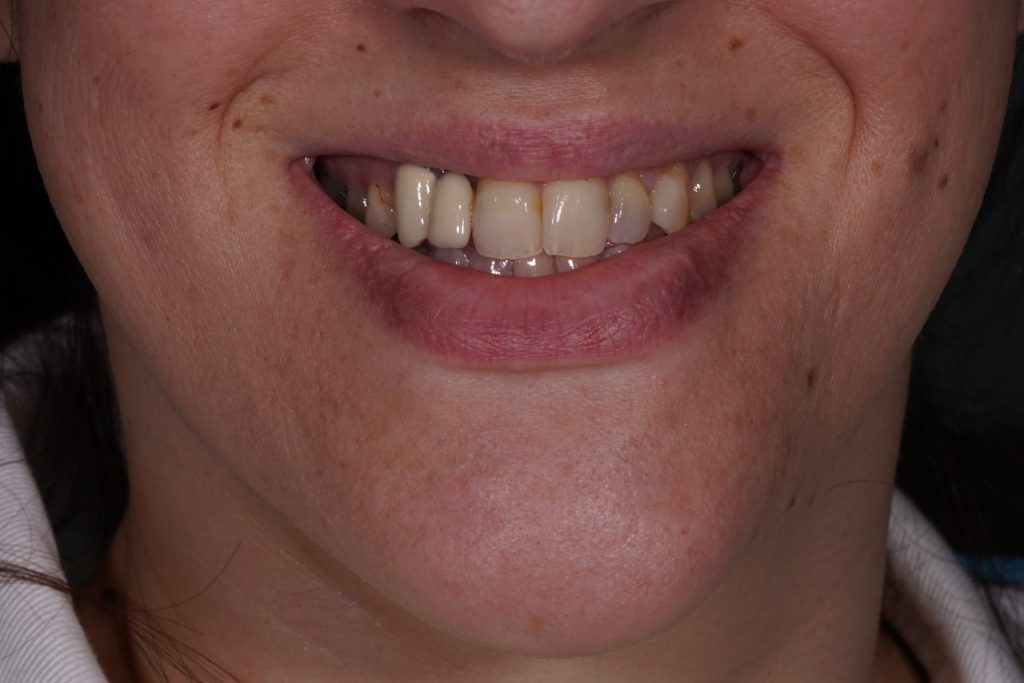 Пациентка 33. Главной целью было добиться максимально естественной реабилитации улыбки. Улучшение цвета и формы также было основным запросом. Для решения этого случая было решено установить 360 композитных виниров . Виниры на 360° — это метод полного покрытия зубов, то есть зубы полностью увеличиваются как снаружи, так и внутри. Для достижения нашей задачи была проведена тщательная эстетическая и функциональная оценка с помощью фотографий и внутриротового сканирования с помощью современного цифрового аппарата Trios 3Shape. сканер. Для анализа формы и изменения дизайна улыбки использовалось специальное программное обеспечение CAD для стоматологии . Перенос новой улыбки был выполнен с использованием точных прототипов, чтобы можно было ориентироваться в посадке и приклеивании виниров на 360 градусов. Для усиления цвета использовались отбеливающие оттенки особо твердых композитов. Зубы были совсем не просверлены. Для очистки и придания шероховатости поверхности зубов использовалась только пескоструйная обработка (порошковая пемза). Неудавшийся мост PFM на верхнем левом клыке и латеральный резец были удалены и заменены мостовидным протезом из 2 циркониев того же цвета, что и соседние композитные виниры.