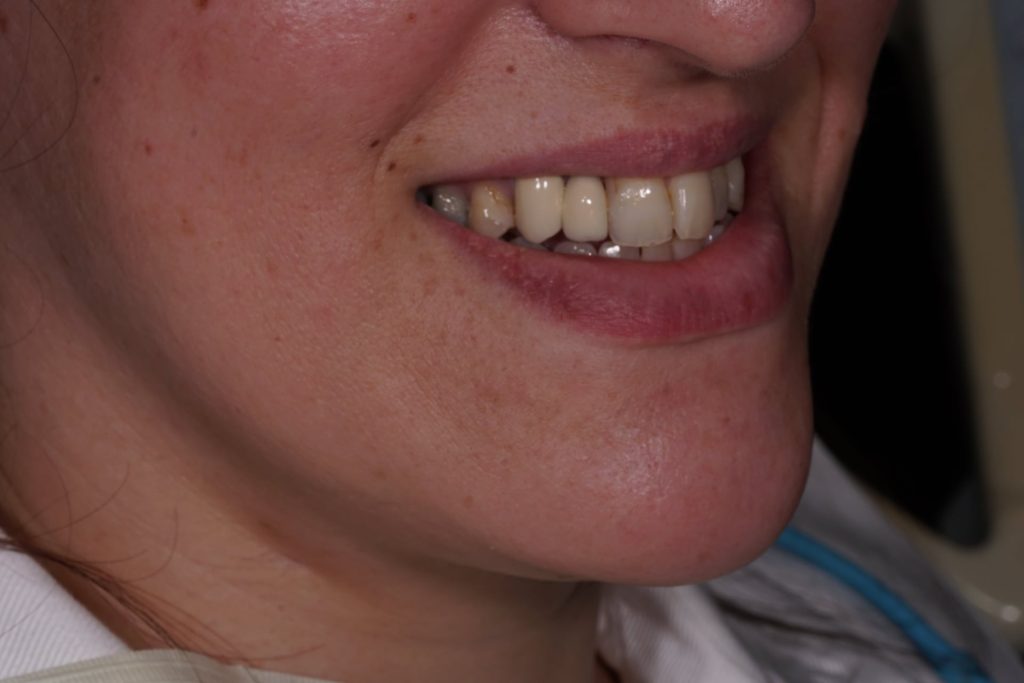 У пациентки наблюдались легкие симптомы (боль при приеме холодной/горячей пищи/жидкости). Симптомы вызваны обнажением дентина изношенных зубов . Дополнительными проблемами были эстетическая дисформация (укороченные зубы) и проблемы с прикусом. Случай решен с использованием передних композитных виниров . Форма была разработана с помощью стоматологического CAD-программы с использованием фотографий лица и улыбки ( см. «Эстетический анализ »). Локализованное изменение цвета зуба на правой боковой стороне устраняется дополнительными слоями опакового композита. Применена концепция «без разрезов и сверлений» . Никакой анестезии . 2 встречи
