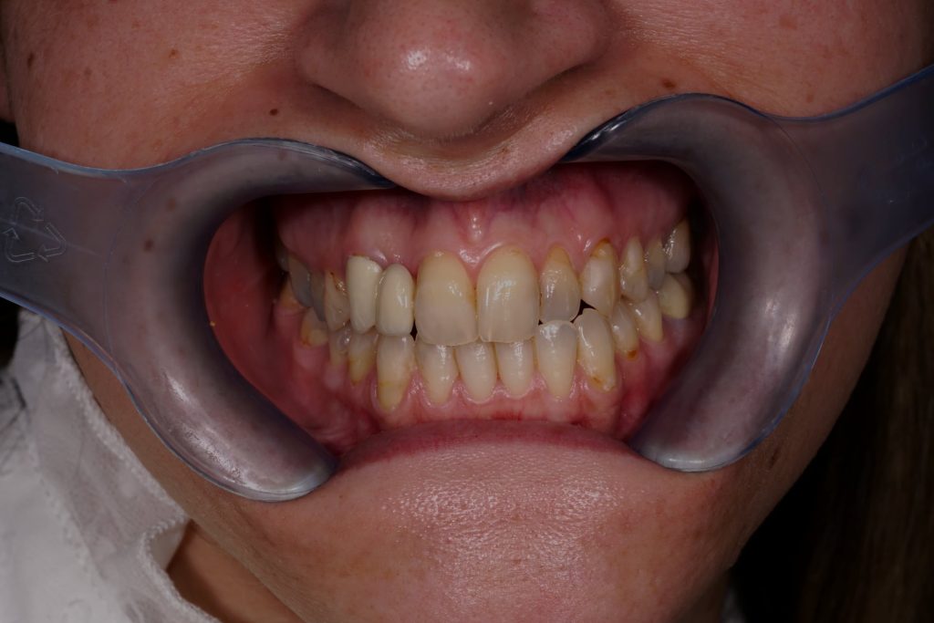 Пациентка с патологической стираемостью и окрашиванием зубов. Ее основное ожидание — «обрести уверенность в себе благодаря очень яркой улыбке».